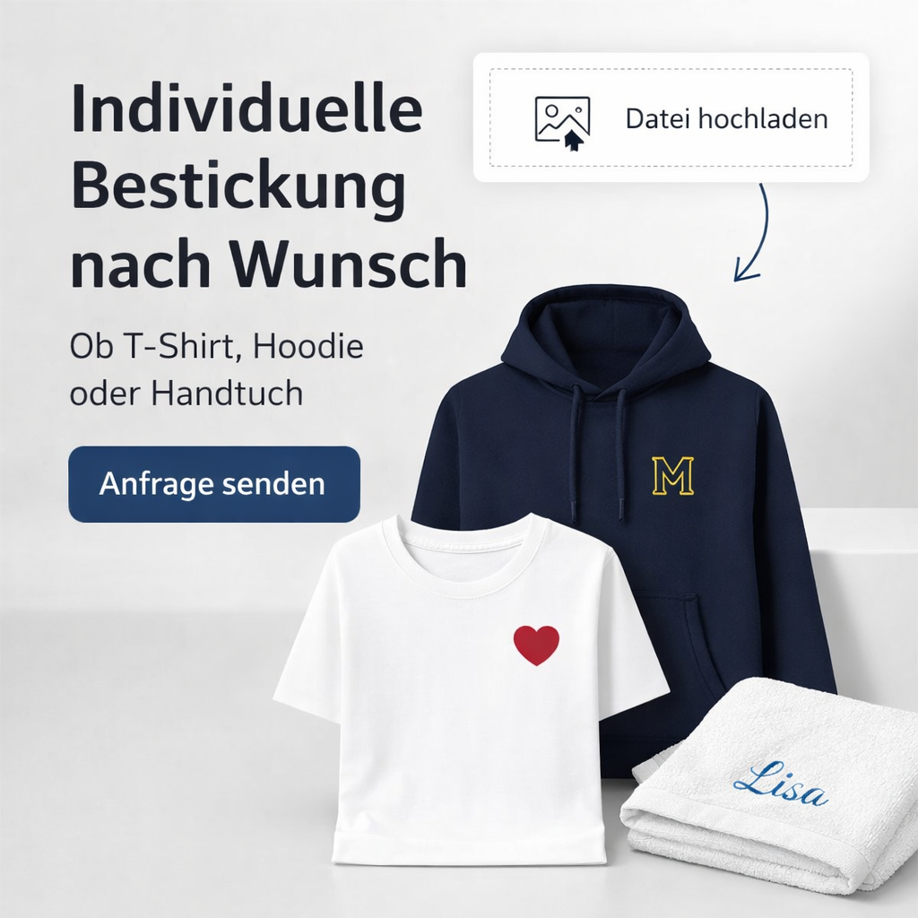 Ob T-Shirt, Hoodie, Handtuch, Kochschürze oder andere bestickbare Textilien: Lade dein Logo, Motiv oder Design hoch und teile uns deine Anforderungen mit.